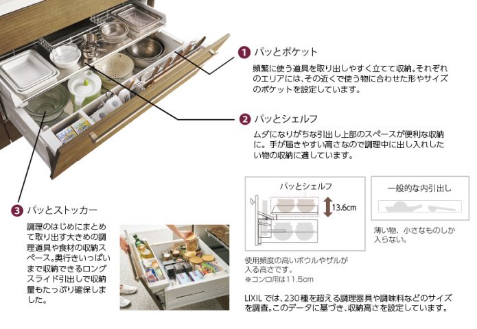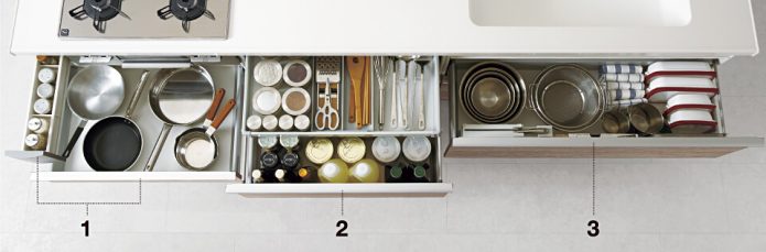 LIXILの収納力が高い「リシェルSI」を例にするとこんな感じ。デッドスペースを作らずに無駄なく収納しつつ、実際に料理を作っている時にも、欲しいものが取り出しやすい工夫がされています。