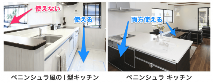 もともとスペースをとりやすい「ペニンシュラ風のI型キッチン」と比べると、さらにそれ以上に設置スペースが必要な点には注意しましょう。