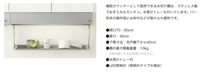 この中で「水切りタイプ」を選択すれば、調理中の一時置きスペースとしても使えるので、その分、下の作業スペースを広く取る事ができます。