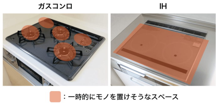 一方で、IHは表面がガラスできれいに油汚れを拭き取れるので、実際に使ってみると一時的に色々なモノを置いておく事が多く、簡易的な作業スペースとして使える事が分かります。