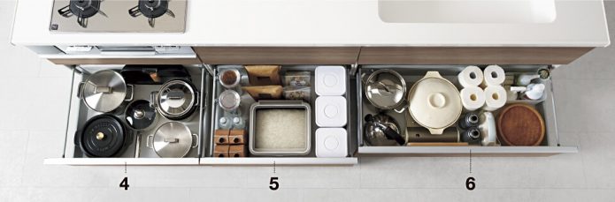 - 4:大きめの鍋やグリルパン等をコンロの一番下に収納。