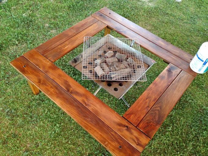 市販のファイアグリルを取り囲むようにして、木製のテーブルを自作。ファイアグリルの熱が伝わり過ぎないように、適度に隙間をあけた設計にします。