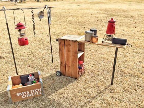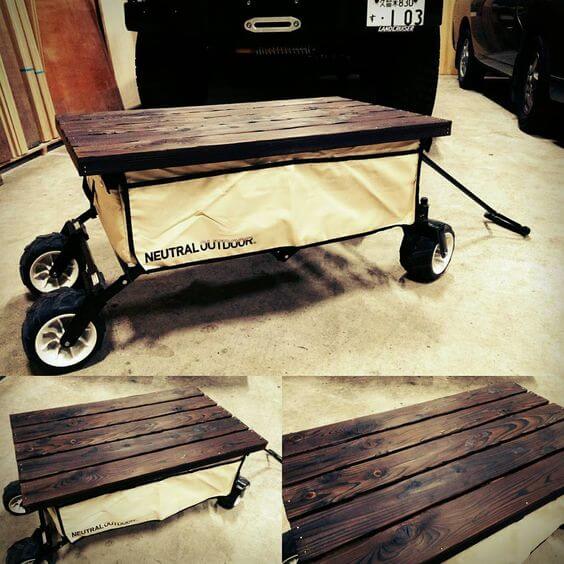 キャンプで使うキャリーワゴンに、そのまま天板をのせてオシャレなテーブルに。