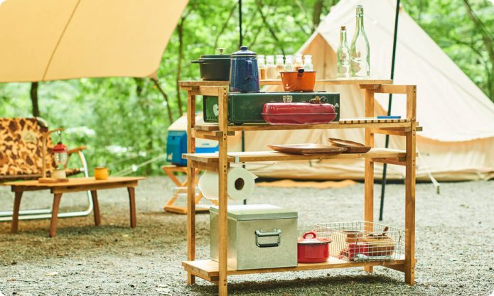 キャンプシーンで実用性のあるテーブルを作りたい!という時に。調理用のテーブルと、モノを収納しておく棚の高さに注目。