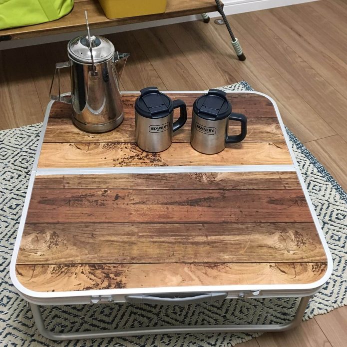 アウトドア用のテーブルにリメイクシートを貼っただけの簡単アレンジ。