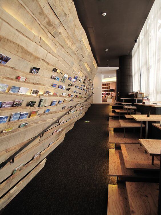 原木をそのまま切り出したような板を重ね合わせていってスリット状にしているディスプレイタイプの本棚。