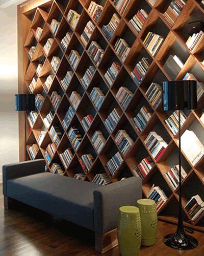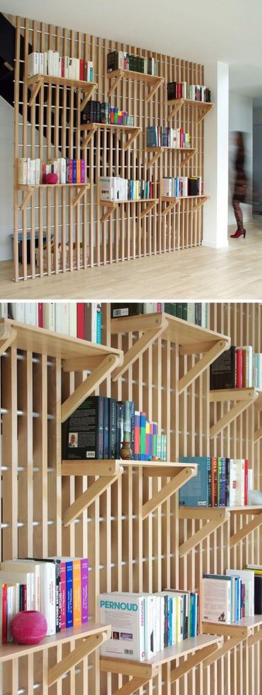 ツーバイ材等を活用して同じものが作れそうなアイデア。格子状に規則正しく並べていって、隙間の部分に自由に本棚を配置できる構造になっています。