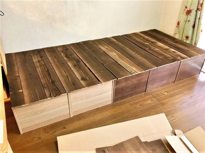 いくつものカラーボックスを組み合わせて、床全体を底上げするようにして使えば、まるでお座敷のようなデザインに。