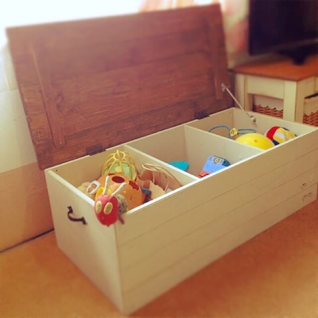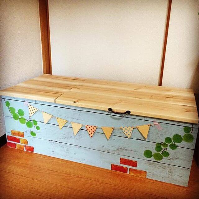 カラーボックスを上向きにセットして、大きめの天板をつけてフタにするだけ。以外にかさばる「おもちゃ」を収納しておけるケースに。