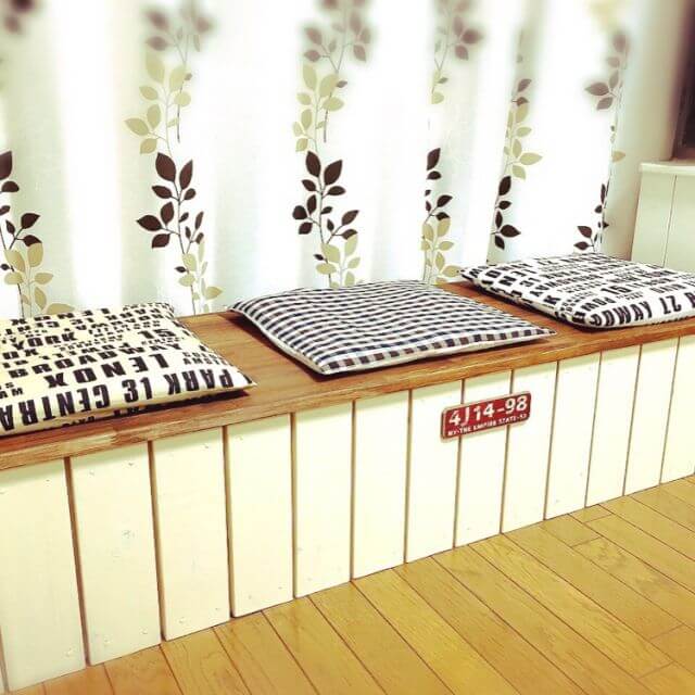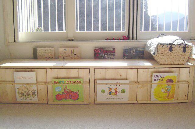 「たまに座る程度」という使い方を予定しているベンチシートにするなら、側面部分も活用して絵本棚風にするのもおすすめ。