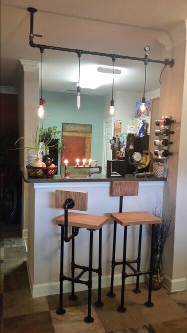 木製の天板と背もたれに、マットなブラックカラーで塗装したパイプをつなげただけのシンプルなカウンター。