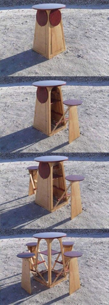 一見すると木製のハイカウンターテーブルのみに見えますが、丸い部分を引き出すと全部で4つの椅子が飛び出すギミック付き。