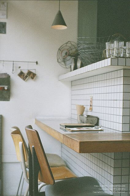 ハイカウンターで使ってる木製の天板と、ハイカウンターの椅子で使っている背もたれ部分の素材を一緒のものに。