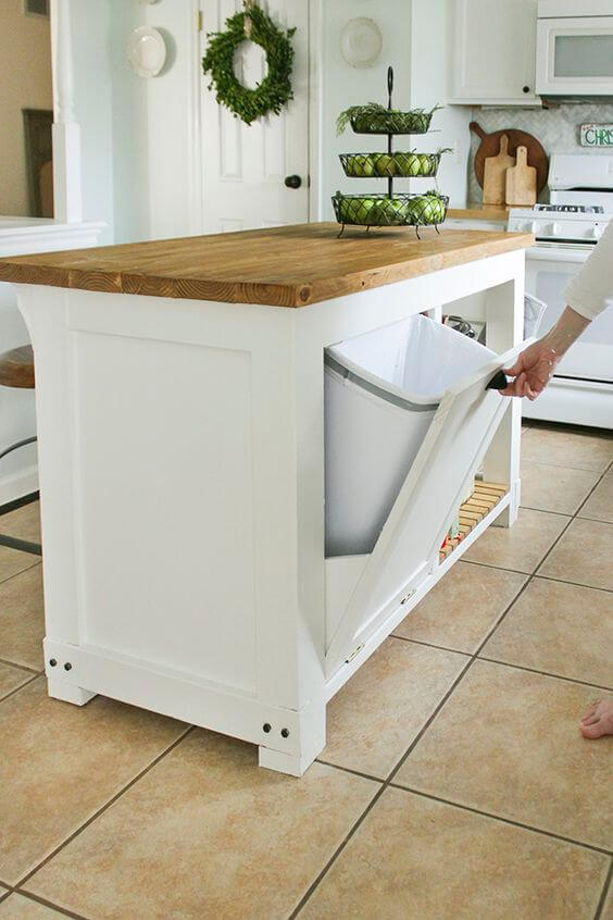 白色ベースの足場にナチュラルテイストな天板をのせただけのシンプルな作業台。足元にはゴミ箱を収納できるスペースも完備。