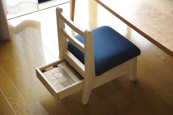 椅子の背面部分が引き出しになっている椅子。写真のように積み木を入れたり、いつも遊んでいるトミカやプラレール等を入れておけるスペースにも。