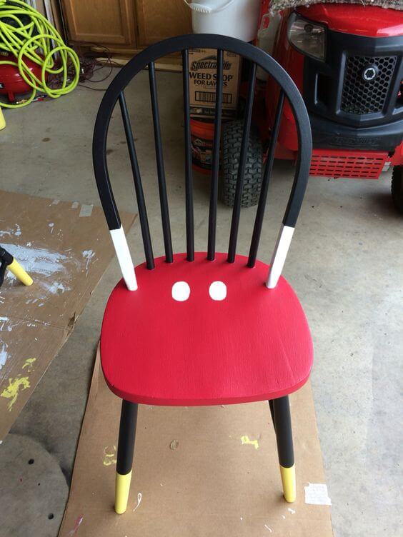 ディズニー好きな子供が喜んでくれそうなミッキーモチーフの椅子。塗装の仕方でミッキー風にしているだけなので、他の形の椅子であっても同じアレンジができるはず。