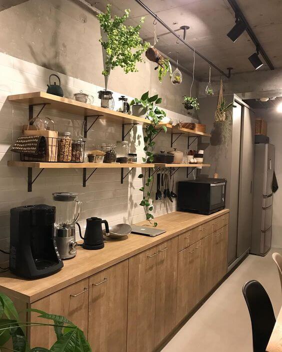 コンクリート系の素材に木目の棚を加えて、モダンな雰囲気のお洒落キッチンに。コンクリート素材は、リメイクシートや壁紙等でも代用する事ができます。
