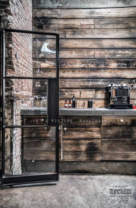 レトロな木目を使った柱に、ステンレス製のスタイリッシュな棚。アンティーク調の「あえて古い」というタイプのレンガを組み合わせた例。