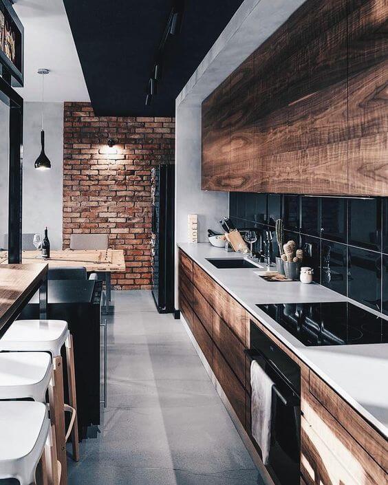 メインのキッチンカウンターは、木目+黒色タイルでモダン&スタイリッシュな雰囲気に。奥の冷蔵庫横の壁 一部分だけをレンガにしてアクセントにしています。