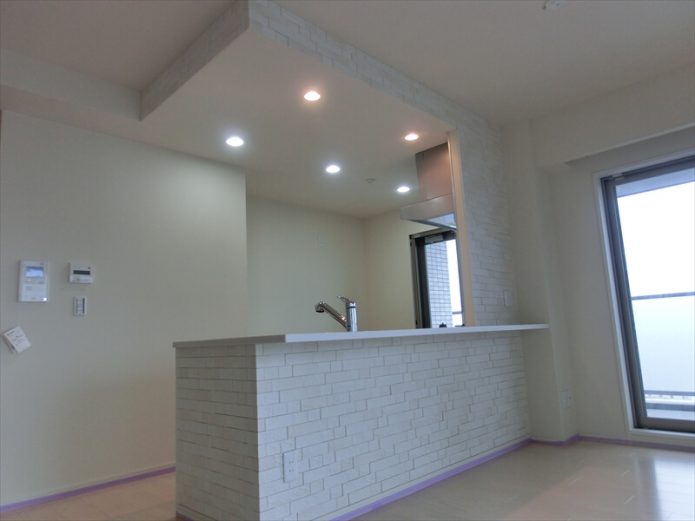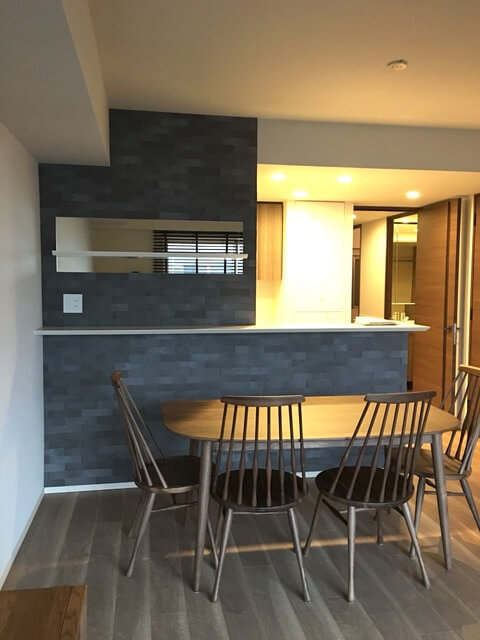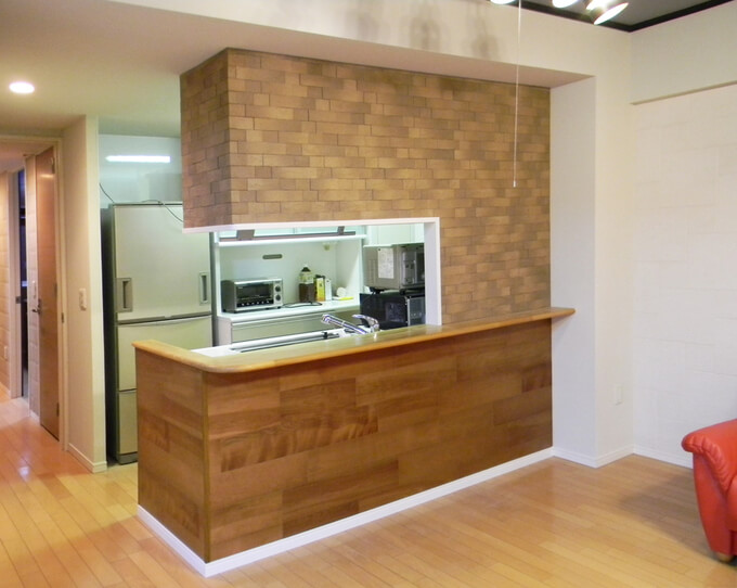 キッチンカウンターの横側部分にだけエコカラットを貼ったパターン。貼るスペースも少なめなので「とりあえず練習で張りたい」という時に試しやすそうなスポット。
