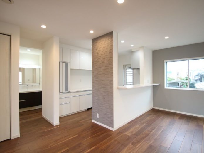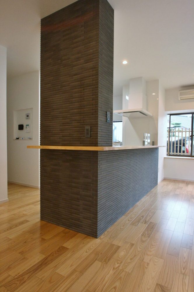 キッチンカウンターの一部部分にだけエコカラットを使用。エコカラットの消臭効果を活かせる配置に。