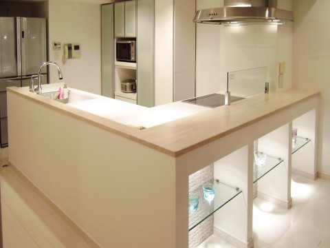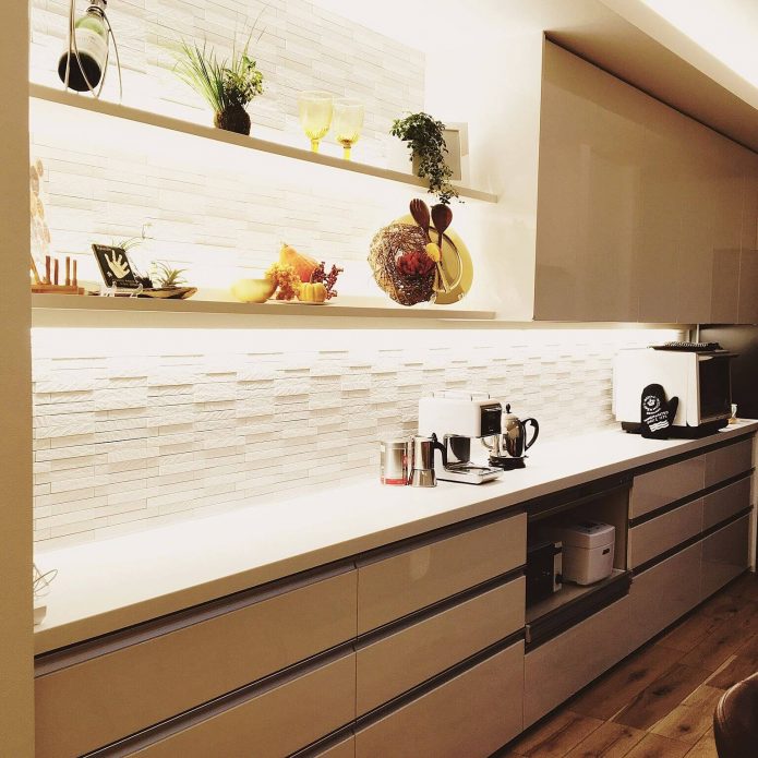 カップボードと組み合わせるように白色のエコカラットを使用。棚に間接照明を使う事で、エコカラットの凸凹が綺麗に出て雰囲気のあるキッチンに。