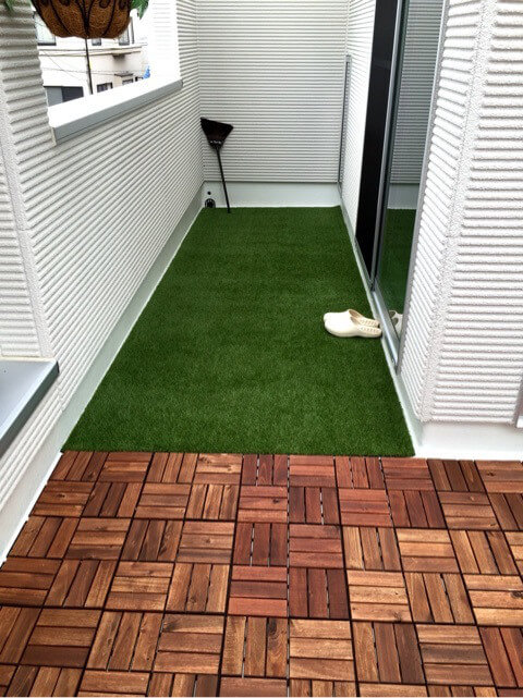 ウッドデッキにフェイクの芝をプラス。ペットを飼っている家なら、ワンちゃんのちょっとしたドッグスペースにもできそう。