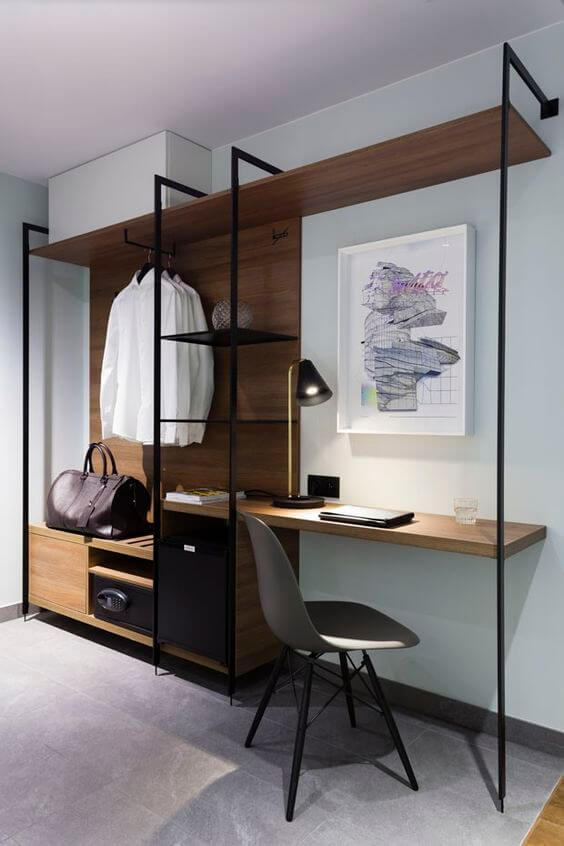 収納棚をマットな質感で塗装。洋服をかけるラックはアイアン系素材を使って、こちらも黒色カラーで統一。奥の白壁とモノトーンカラーで組み合わせています。