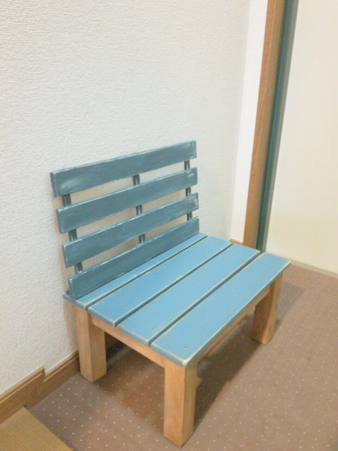すのこを座面と背もたれ部分に使って、ちょっとレトロな雰囲気のある水色の塗料で塗装したもの。