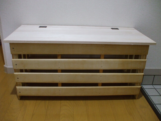 すのこを側面に使い、天板は丁番で固定し開くようになっているタイプ。玄関先においておけば、座って靴をはけつつ、緊急用の備品を収納しておけるケースにできます。