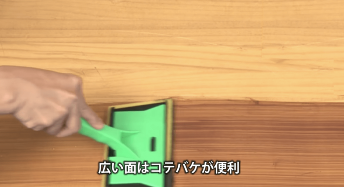 ハケでそのまま塗っていっても良いですが、天板の広い面は「コテバケ」を使うと一気に綺麗に塗る事ができます。