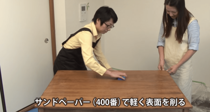 細目の400番のサンドペーパーで、表面のニスを削っていきます。