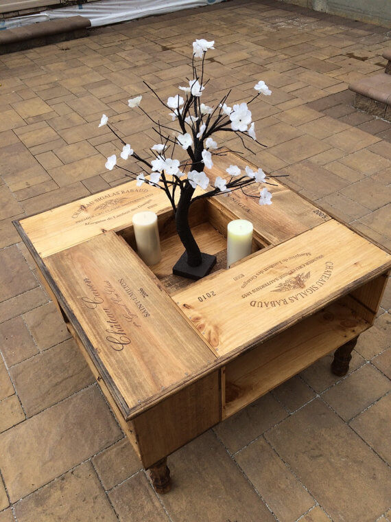 ワインの木箱を横向きにして、4つを重ね合わせるようにしてテーブル。
