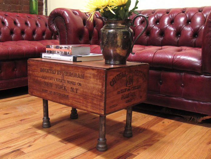 ワイン木箱側面のワインの銘柄が入った部分のデザインを活かして、引き出し式の収納付きテーブルに。